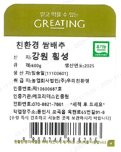 [그리팅] 친환경 쌈배추(알배기) 600g