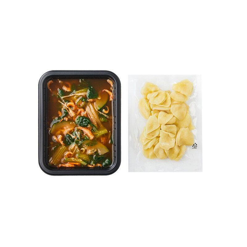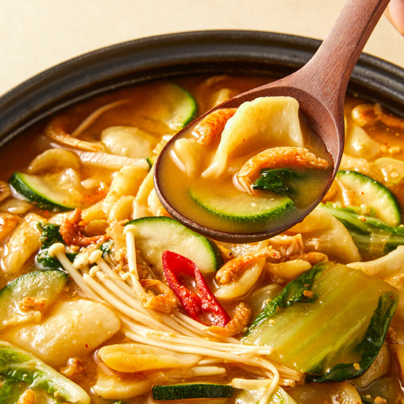 그리팅이 선보이는 털레기 수제비는 된장 베이스 국물에 국산 얼갈이 배추와 무, 볶은 건새우를 더해 진하고 시원한 감칠맛을 냈어요. 쫄깃한 식감의 수제비는 진한 국물을 머금어 씹을수록 그 맛이 배가 되죠. 따뜻한 국물에 밥을 말아 국밥처럼 즐기셔도 좋아요.