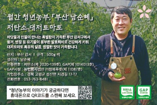 10년 넘게 다니던 철강회사를 그만두고 가족과 함께 건강한 땅을 일구고 있는 남순혜 청년농부가 정성껏 키운 토마토는 왕겨와 볏짚을 발효한 퇴비로 재배해 새콤달콤하면서도 짭짤한 대저토마토 특유의 풍미가 살아 있어요.