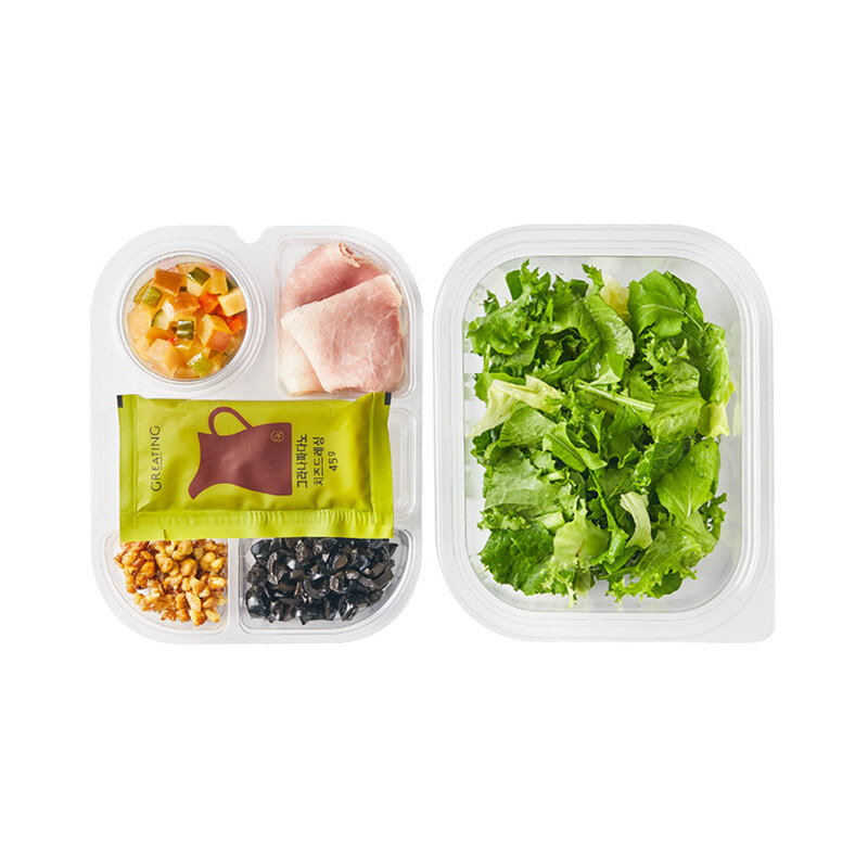 샐러드의 포인트가 되어줄 사과 카르파쵸는 절인 사과, 오이, 청피망, 파프리카를 볶아 완성했어요. 푸짐한 채소 위로 토핑을 올린 뒤, 풍미 가득한 그라나 파다노 치즈 드레싱을 뿌려 상큼하게 즐겨 보세요.