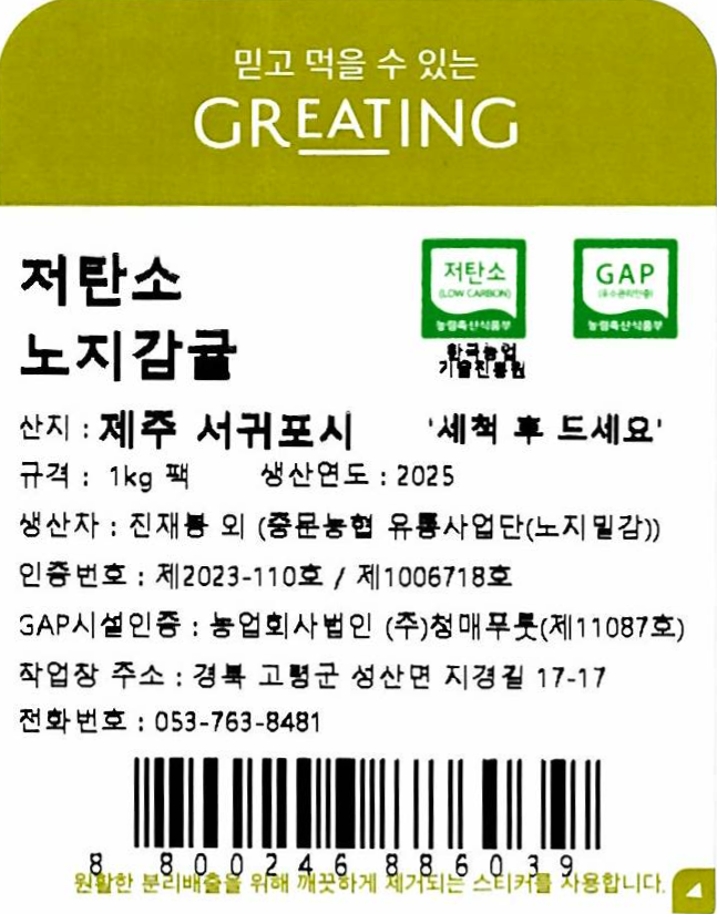 환경을 생각하는 저탄소 농법으로 재배된 노지 감귤은 제주도의 바다 바람을 오롯이 머금고 자라 새콤달콤, 감귤 특유의 매력이 가득하답니다.