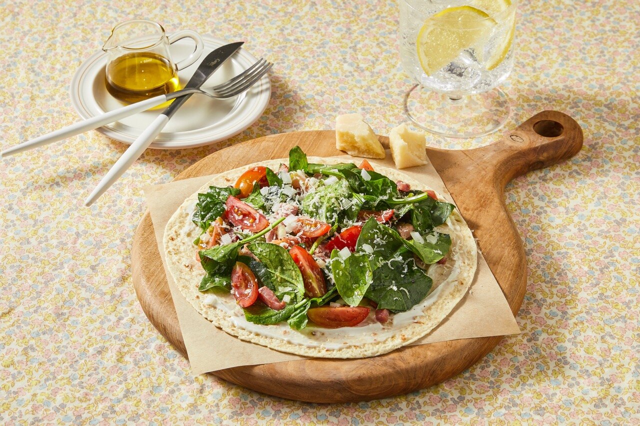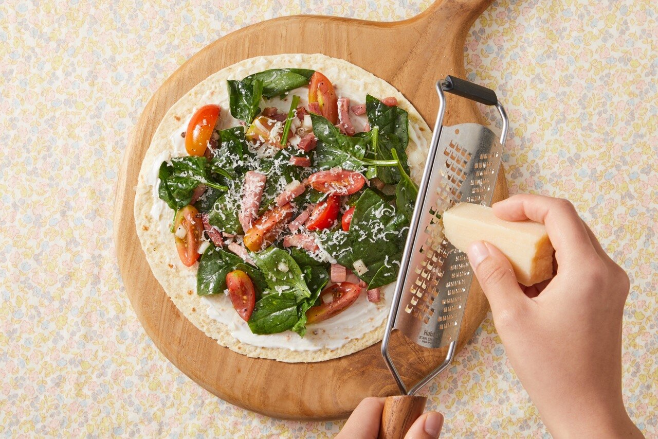 준비한 채소 토핑과 베이컨을 그 위에 얹은 후, 그라나파다노 치즈를 기호에 맞게 뿌려 주면 완성이에요.