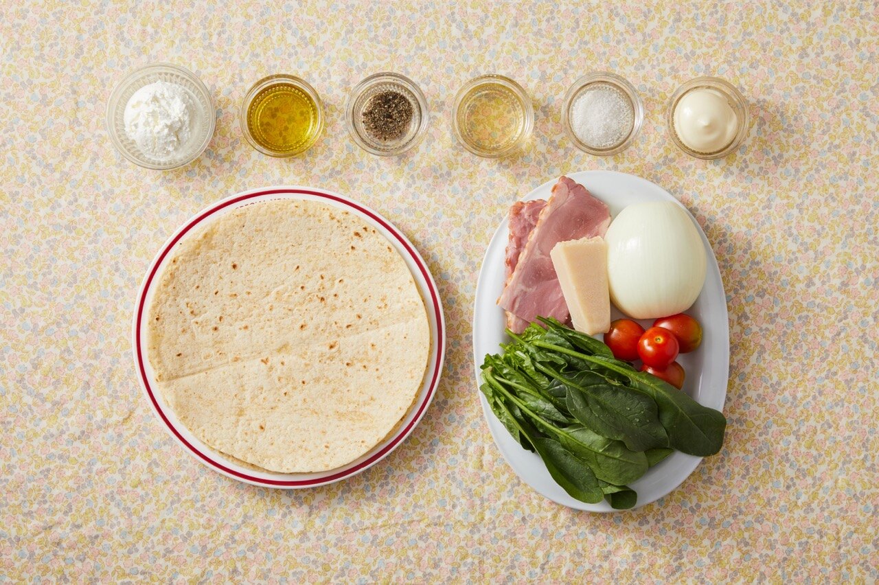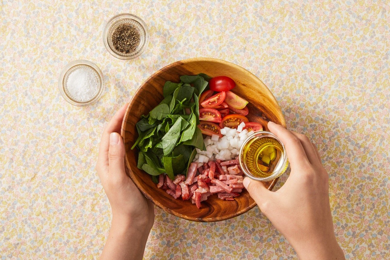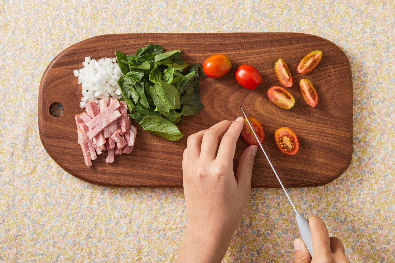 양파와 베이컨은 다지고, 시금치는 듬성듬성 크게, 방울 토마토는 1/4컷으로 썰어 주세요.