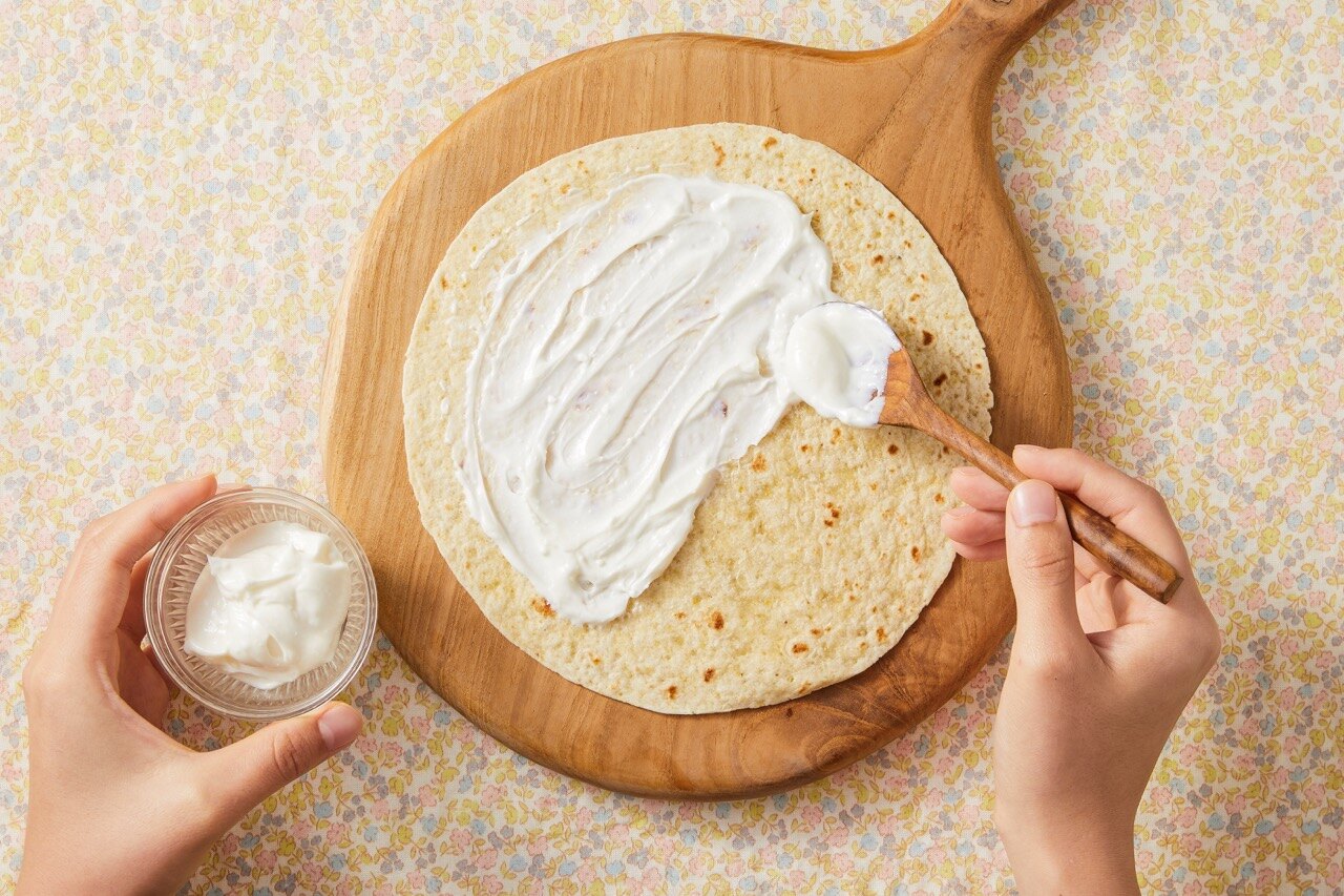 구워 놓은 또띠아에 요거트 소스를 고루 펴 발라주세요.